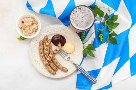 Tasty sausages, flag of Bavaria, sauerkraut, sauces and mug with beer on white background. Oktoberfest celebration