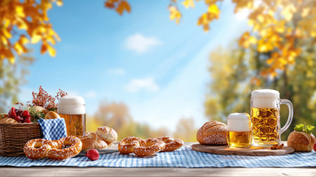 Oktoberfest festive background with traditional Bavarian checkered tablecloth, pretzels and beer mugs.