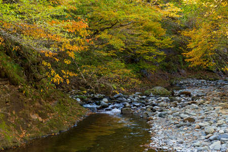 Beautiful landscape at Naruko Gorge with the colorful foliage of autumn season and the flow of clear natural stream in Naruko City, Miyagi Prefecture, Japan.