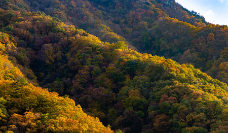 November 23,2018 - Mitake, Tokyo-Japan, The romatic autumn scenery on the Mitake Mountain, the maple is starting changing its leaf to red color. Many of Japanese come for camping and dating