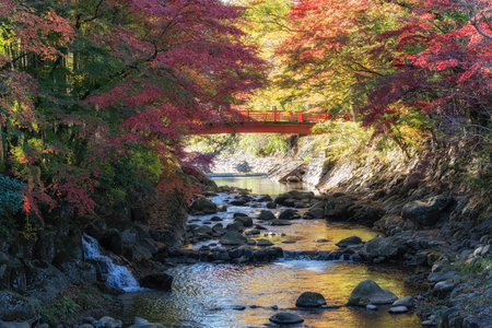 A refreshing valley on the Iwato River with Amiwado Shrine in autumn