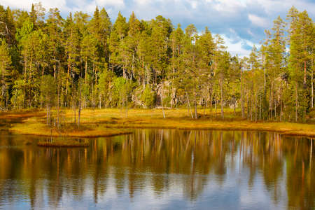 Finland forest and lake at Pieni Karhunkierros trail. Autumn season