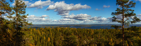 A stunning panoramic view from a high vantage point captures the vast autumn forest with golden foliage stretching towards a tranquil lake, framed by a deep blue sky with scattered clouds. Captured in Finland, Europe.