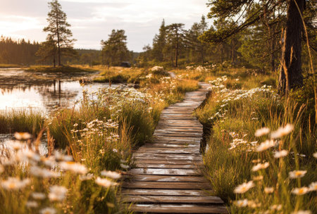A wooden pathway winds through a marshy landscape, surrounded by wildflowers and tall grasses. The scene is bathed in warm sunlight, creating a golden hue across the environment. The image evokes a sense of tranquility and is suitable for various commercial uses, including travel and environmental content.