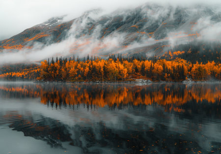 A scenic view of a lake in Alaska, with a forest of orange and yellow trees reflecting in the still water, as mountains rise in the background, partially obscured by fog.