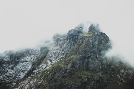 Fog, clouds, rocks and cliffs on Veslehødn Veslehorn mountain in Hemsedal, Norway.