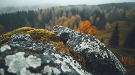 Close-up of lichen-covered rocks and moss, overlooking a misty forest in autumn. The muted colors and soft focus create a serene and contemplative atmosphere.