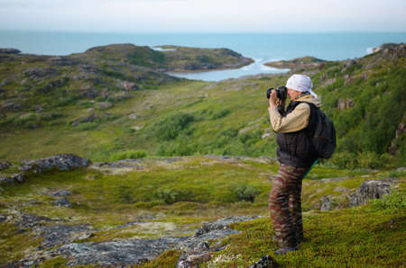 tourist with a camera on the coast of the Barents Sea