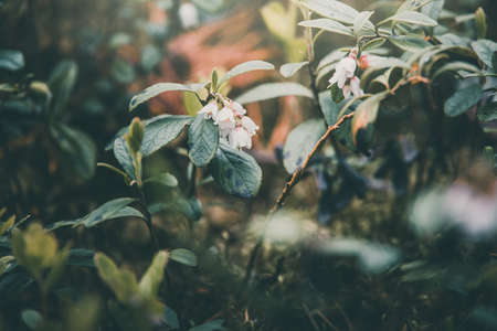 white small blueberry flowers blooming in the forest