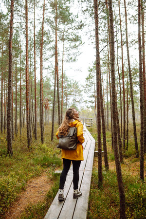 Woman tourist in a yellow coat with a backpack traveling along a wooden path in the forest, Concept of travel with nature.