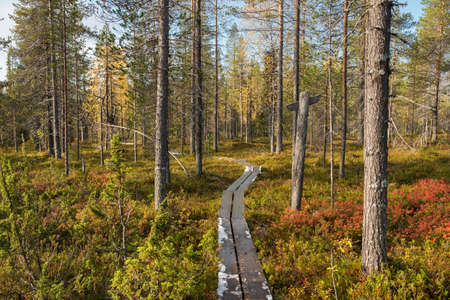 Wooden path in the colorful autumn tundra forest