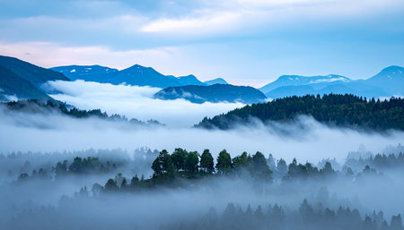 Mountain landscape with coniferous trees in the foggy morning.