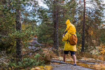 Tourism. Hiking. Ladoga skerries. Father and son tourists in yellow raincoats on stone islands in the forest. Republic of Karelia, Russia.