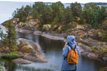 Tourism. Hiking. Ladoga skerries on Lake Ladoga. A female tourist in a raincoat with a backpack on the rocky islands looks into the distance. Republic of Karelia, Russia.