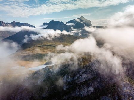 Aerial view on mountains ridge over clouds adventure journey traveling outdoor in Norway active vacations sunset Segla mountain, Senja.