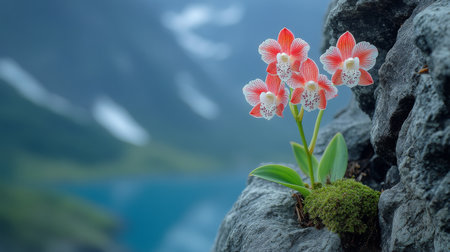 Vibrant orchids emerge from rugged stones overlooking a breathtaking mountain lake.