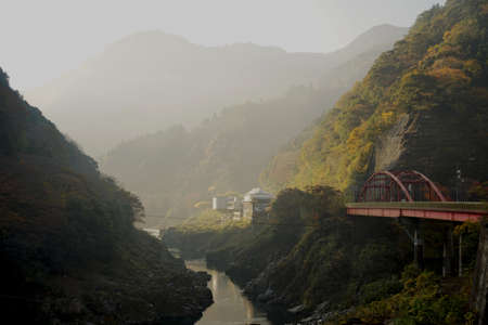 beautiful evening scenery at tadami river with iron bridge in autumn