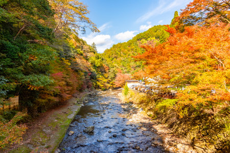 Autumn foliage over Kiyotaki river on Takao mountain, Kyoto, Japan
