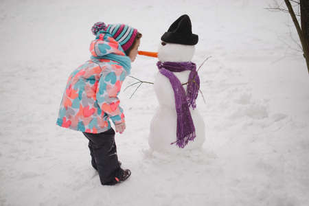 A happy child playing with snow. An adorable little girl is making a snowman in a heavy snowfall. Winter activities for children.