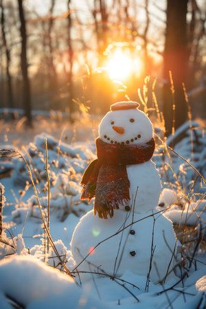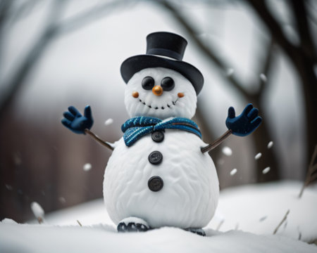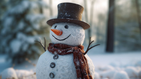 A happy snowman wearing a top hat and a scarf stands in a snowy forest on a bright winter day