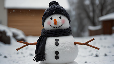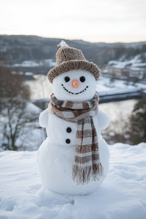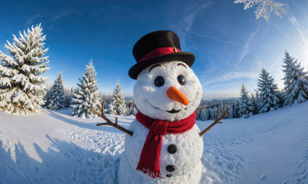 A delightful and charming snowman stands proudly in a serene winter landscape, showcasing a colorful scarf, a stylish hat, and an inviting smile that fills the scene with joy and warmth