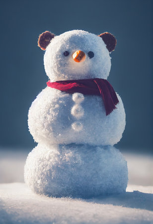3D rendered computer generated image of an adorable snowman. Cute and appealing winter white snowy blizzard weather and happy frozen whimsical snowman teddy bear look 3D shading