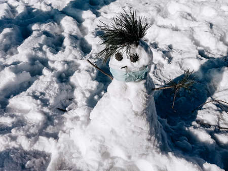 Christmas or xmas decoration. Happy holiday and celebration. New year snowman from snow in cap and mittens. Winter activity, sport and fighting. Snowman with baseball bat.
