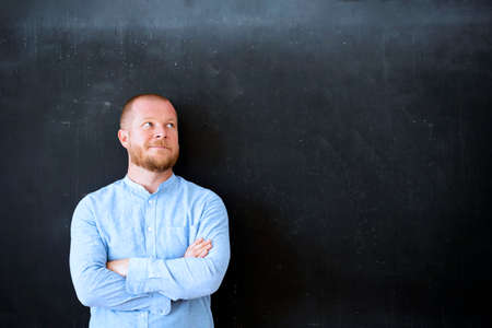 A cool bald man in glasses standing with his back against a greenish wall thoughtfully, his head raised, arms crossed