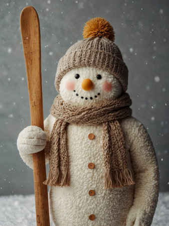 A snowman with a knitted scarf and hat, buttons on the front, and a ski in his hand. Light snowfall in the background.