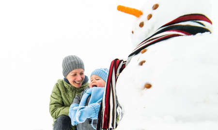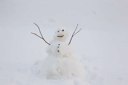 Happy snowman in winter scenery. Postcard or background. High quality photo