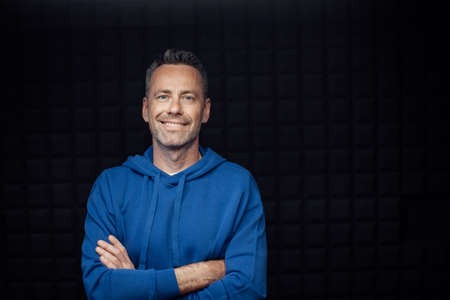 Portrait of happy mature man with arms crossed standing in studio with dark background and looking at camera.