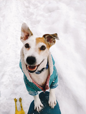 Top view of cute jack russell dog in coat standing at owners feet in winter