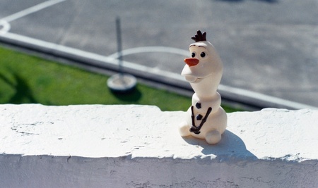 Tourism and travel concept: Miniature little snowman standing alone in isolated background