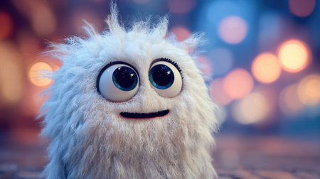 A fluffy white creature with large expressive eyes and a friendly smile is the central focus. The image showcases soft textures and a vibrant color palette, enhanced by bokeh lights in the background. This whimsical artwork could be suitable for various commercial uses, including children's media or character design.