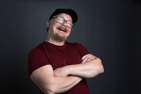 Happy man with down syndrome smiling and looking at camera, portrait photo of an elderly man with down syndrome smiling beauty