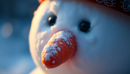 Close-up of a smiling snowman with a carrot nose and coal eyes, wearing a warm scarf and a woolen hat.
