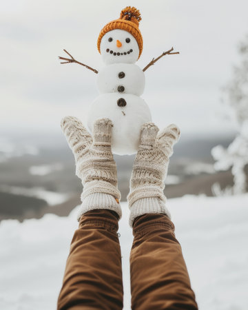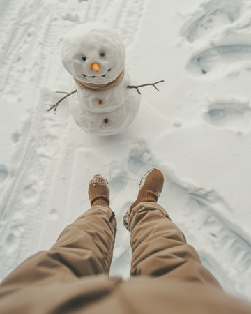 Adult's hand holding snowman, legs in white sneakers on snowy ground, top view.