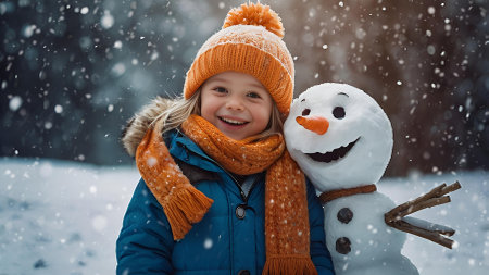 Adorable snowman wearing a blue hat and scarf, smiling amidst gentle snowfall. Captured during golden hour, the scene exudes cinematic winter warmth and charm.