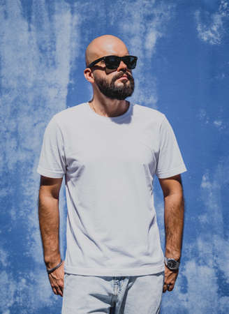 Male model with beard wearing white blank t-shirt on the background of an blue wall