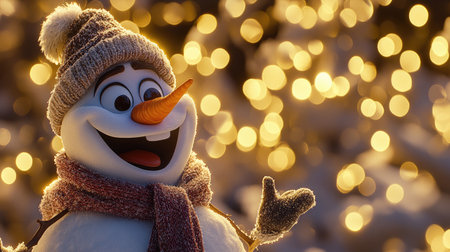 A cheerful snowman with a bright smile stands against a backdrop of glowing winter lights. The whimsical character embodies joy and festive spirit, perfect for holiday themes.