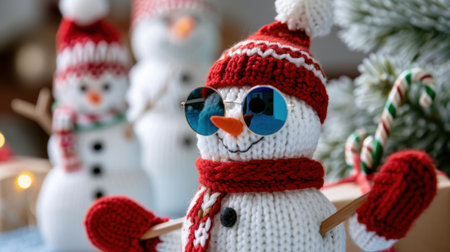 A charming snowman character dons sunglasses, a vibrant scarf, and knitted gloves in a cozy holiday setting, radiating joy and festive warmth.