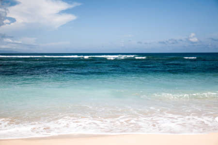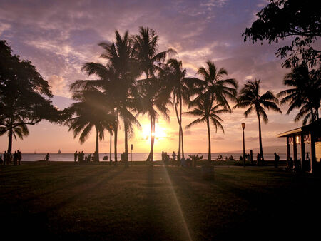 View of the sandy beach at sunset, Honolulu, Hawaii. Copy space for text