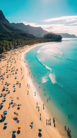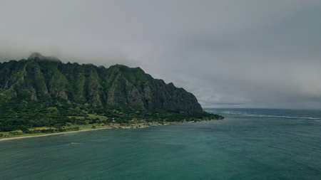 Aerial shot on Oahu Hawaii Island. Drone flies on a sandy beach. View of the rocky mountains. Early morning on a tropical island. Waves of the Pacific Ocean wash the shore.