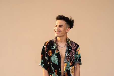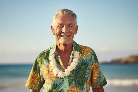 Beautiful man in a Hawaiian shirt, grinning at the camera against a backdrop of the water.