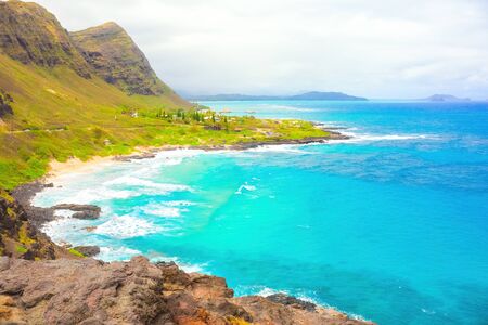 beautiful view of blue ocean water at Makapu'u beach park as seen from above on Makapu'u Lookout. Soaring mountain, blue waters, overcast cloudy skies on Oahu, Hawaii