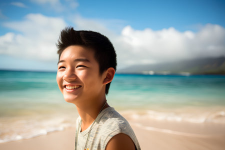Portrait of a young Asian boy standing on the beach in Hawaii
