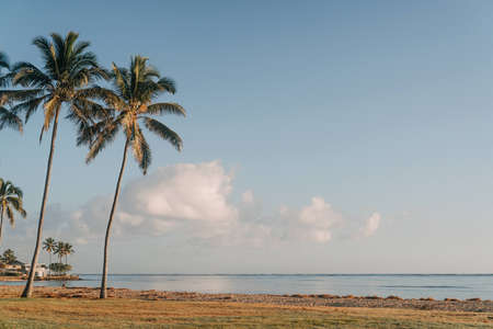 Palm grove near water on the tropical island, Hawaii, USA. Scenic view on the tall palm trees of Waikiki beach marina.