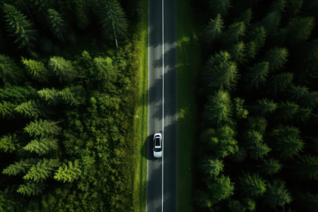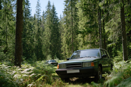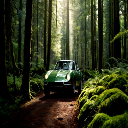 Rally car racing through a forest dirt road, kicking up dust. The scene is surrounded by tall trees and dense vegetation. Concept of adventure and motorsport