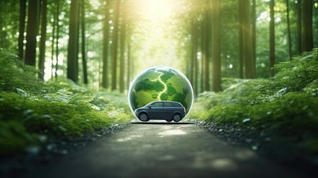 Car with a globe in the forest. 3D render. Elements of this image furnished by NASA