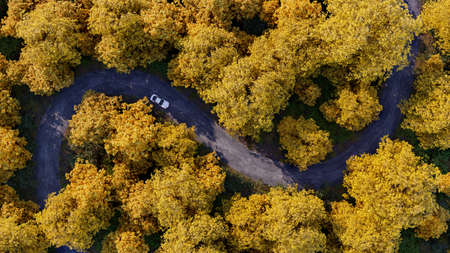 Aerial view of rural road with red car in yellow and orange autumn forest in rural Finland.